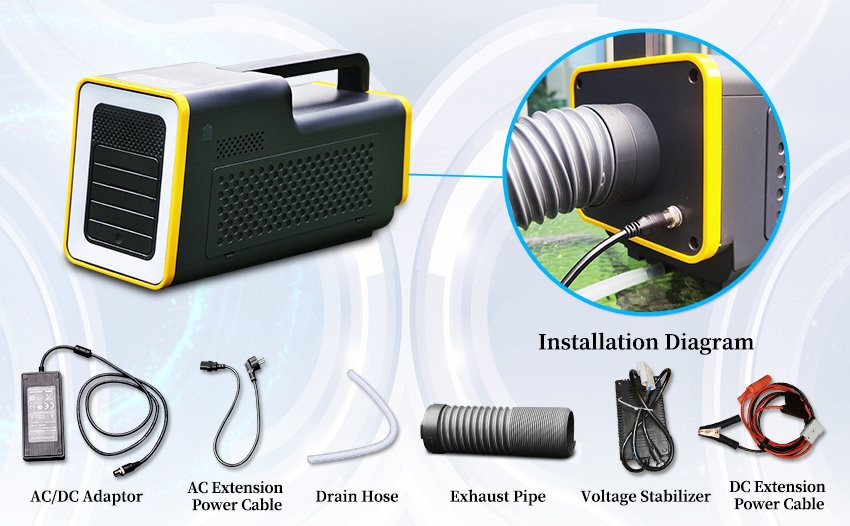 Tato 12voltová stanová klimatizace je přenosná s malými rozměry, nízkou hmotností a může se volně pohybovat. Kompletní balení včetně střídavého proudu, potrubí, odtokového potrubí vody, napájecího kabelu, zesilovače napětí a adaptéru je volitelné podle požadavků uživatele.